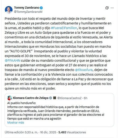 Finalmente, lanzó un mensaje directo a la presidenta, instándola a detener la escalada, abandonar los llamados a la calle y aceptar la derrota, advirtiendo que Honduras no permitirá la instauración de modelos autoritarios disfrazados de defensa popular.
