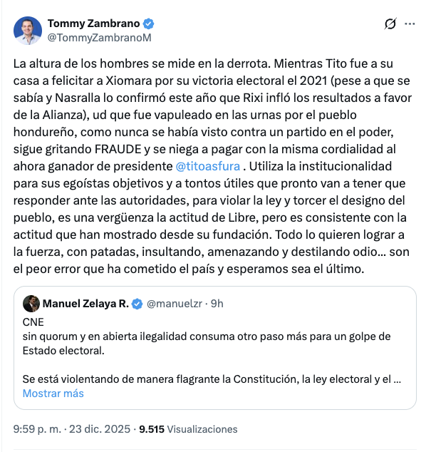 Tegucigalpa, Honduras | HonduPrensa.Com – El líder parlamentario del Partido Nacional de Honduras, Tommy Zambrano, respondió con tono severo a las declaraciones del dirigente de Libertad y Refundación, Manuel Zelaya, quien denunció irregularidades en el Consejo Nacional Electoral. Zambrano sostuvo que dichas acusaciones buscan desacreditar el proceso y presionar a los árbitros electorales para revertir un resultado adverso.