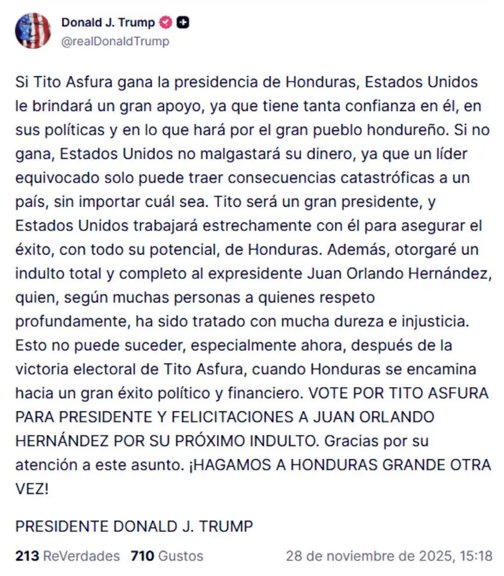 En un comunicado publicado en Truth Social, Trump enfatizó: “Si Tito Asfura gana, Estados Unidos apoyará plenamente sus políticas y su visión para el Gran Pueblo de Honduras. Un líder equivocado solo trae resultados catastróficos, por lo que nuestro respaldo es estratégico y necesario”.