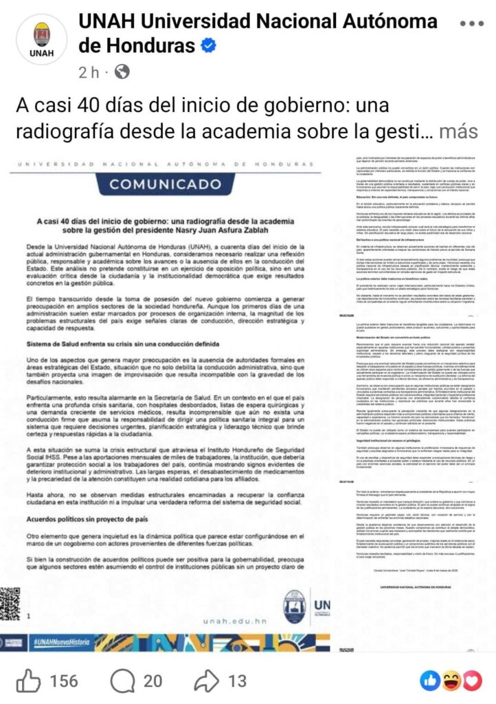 El estudio, elaborado desde sectores académicos de la UNAH, aclara que su postura surge desde una evaluación ciudadana con base técnica, no desde confrontación partidaria. El informe sostiene que los primeros días de una administración suelen dedicarse a organización interna del aparato estatal; sin embargo, la magnitud de los problemas estructurales de Honduras exige liderazgo firme desde el inicio.