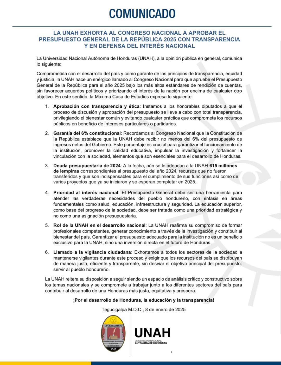 La UNAH expresa que, como parte de su compromiso con el desarrollo de Honduras, exige que el Congreso Nacional apruebe el presupuesto de 2025 con altos estándares de transparencia, sin ceder a intereses políticos que puedan desviar los recursos destinados a las necesidades nacionales. La educación superior, en este contexto, debe ser considerada una prioridad estratégica, y no una simple asignación más dentro de las finanzas públicas. La transparencia en el proceso es clave, según la Universidad, para que los recursos sean utilizados de manera eficiente.