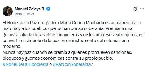 «Premiar a una golpista, aliada de las élites financieras y de los intereses extranjeros, es convertir el símbolo de la paz en un instrumento del colonialismo moderno», afirmó Zelaya en su publicación.